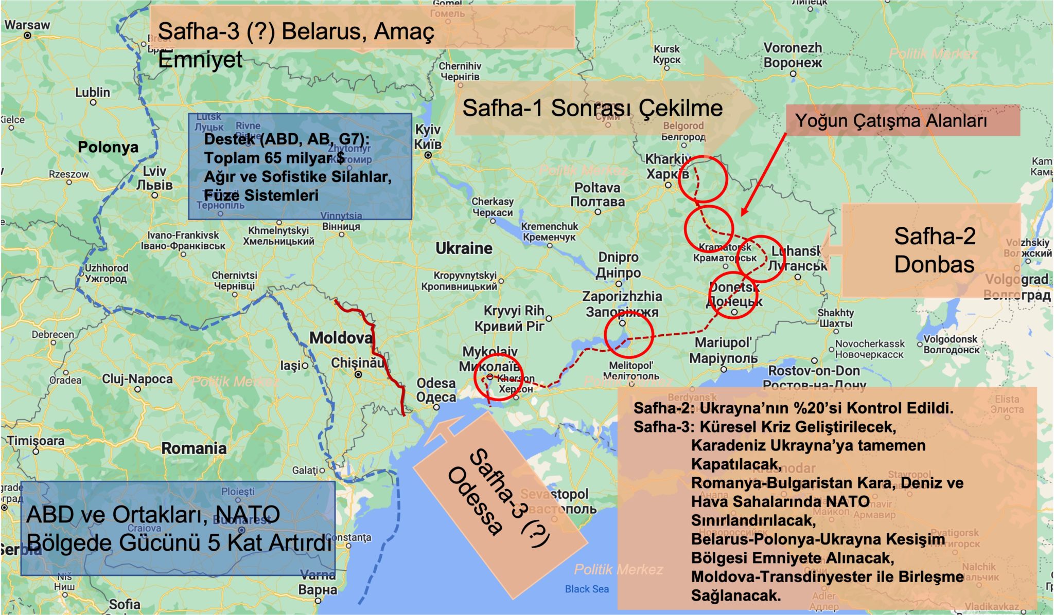 - 24 Şubat 2022, Putin’in konuşması ve savaş ilanı, böylelikle Ukrayna Harekatı’nın başlatılması, siyasi hedef NATO’nun kesinlikle dışarıda tutulması, askeri hedef Donbas’ın kurtarılması;
